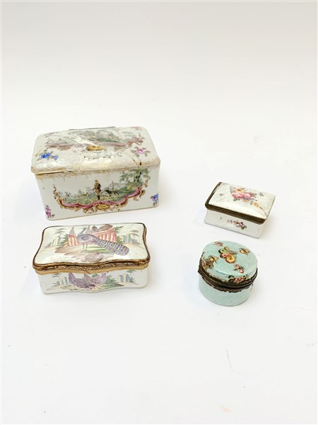 Lotto composto da quattro tabacchiere in porcellana e smalti di diversi decori.