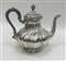 Teiera in argento con base circolare, corpo sbalzato a "torchon" e presa a ricc