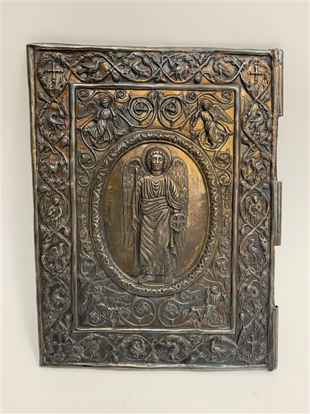 Parte di rilegatura in argento sbalzato e cesellato ad angeli, volatili e volute (cm 25x19) (difetti e mancanze)
