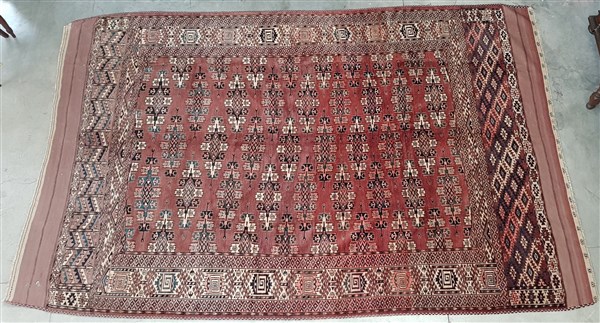 Tappeto Yomut, Turkestan Occidentale, Decoro con Kepse Gaulle su fondo bordeau