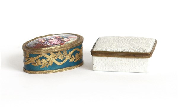 Lotto composto da una tabacchiera con coperchio in porcellana decorata a fiori, interno del coperchio decorata con miniatura raffigurante Nobildonna ed una di forma ovale in porcellana decorata in policromia con scena galante rivestita in metallo cesellato a rami con foglie e volute (difetti, restauri e mancanze)