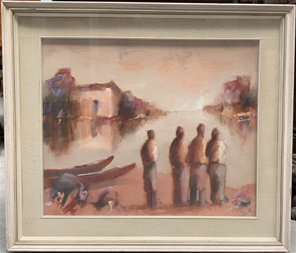 "Pescatori in attesa" olio su tela (cm 50x60) firmato in basso a destra. Al retro: iscritto, datato 1971. In cornice