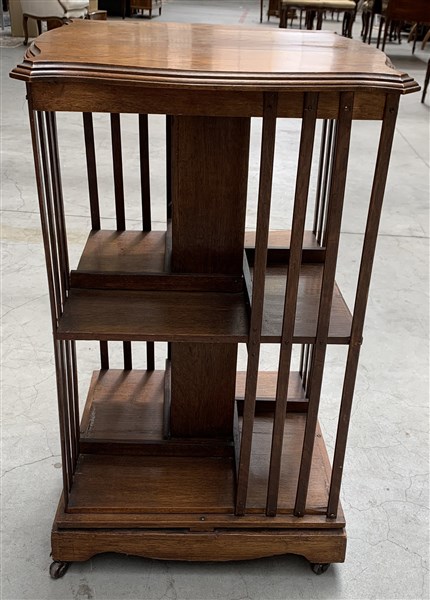 Lot 107 | Libreria da terra in rovere con piano sagomato,munita di rotelle (cm 53x83x51)