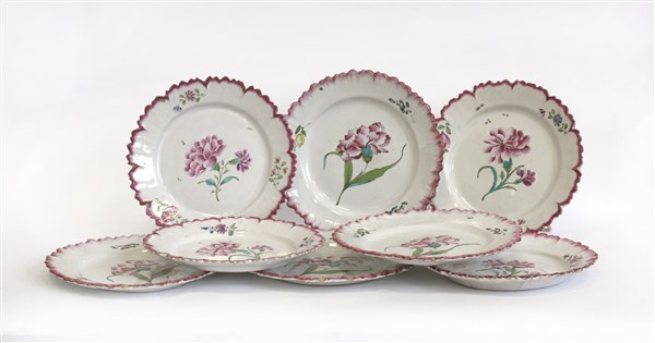 Gruppo di otto piatti in maiolica con bordo sagomato decorata a fiorni in polic