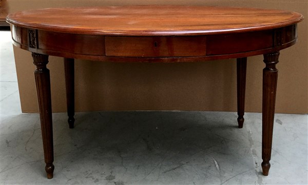 Tavolo ovale in noce a due cassetti nella fascia e quattro gambe rastremate e scanalate (cm 151x77x101) (difetti)