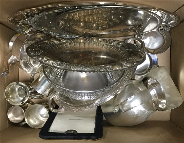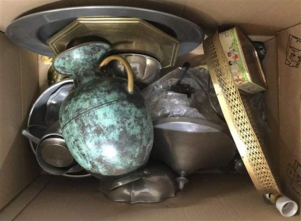 Lotto composto da due cartoni contenenti oggetti di diverso uso in peltro, metallo argentato e altri materiali (difetti)