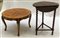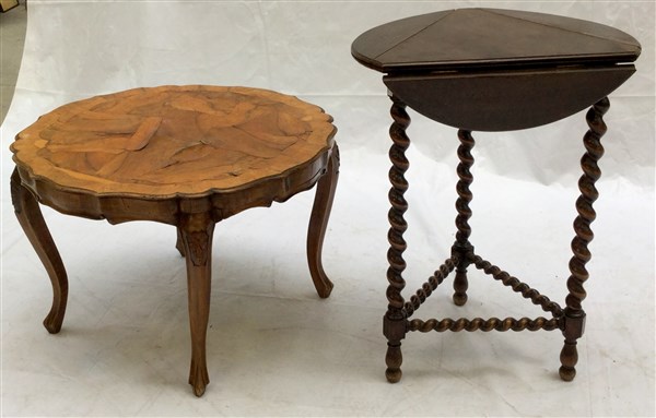 Lotto composto da un tavolino ad alette con gambe a torciglioni e un tavolo basso di forma mossa lastronato e filettato (misure diverse) (difetti)