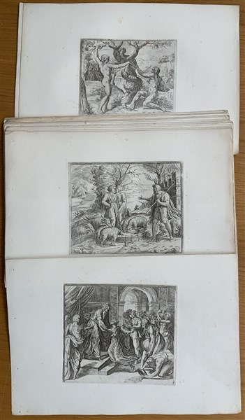 Cartella contenente una serie di cinquanta incisioni di Orazio Borgianni a soggetto biblico, tiratura tarda (fogli cm 27x39) (difetti)