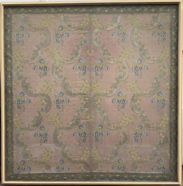 Tessuto broccato in seta e argento, Francia, prima metà secolo XIX. Decoro a meandro con rami fioriti su fondo rosa operato tono su tono. In cornice (cm 110x110) (difetti)