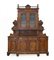 Credenza di forma architettonica con parte superiore a due ante a vetri con cifre incise, parte inferiore a quattro ante e quattro cassetti (cm 210x270x70) (difetti)