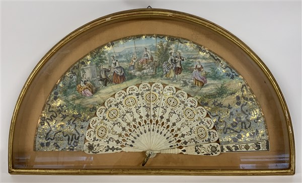 Ventaglio con stecche in avorio inciso e pagina in carta decorata a scene galanti. Secolo XIX, in teca (difetti)