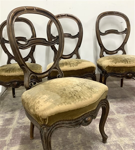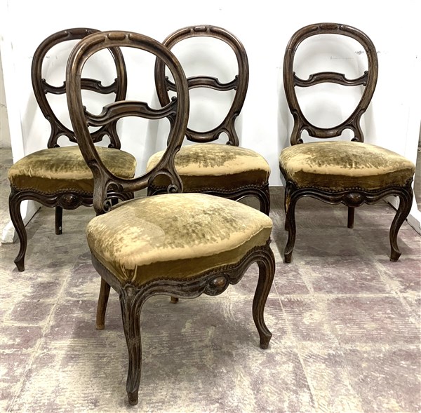 Gruppo di quattro sedie con schienale ovale a giorno, gambe e fascia sagomate e intagliate (difetti, restauri e mancanze)