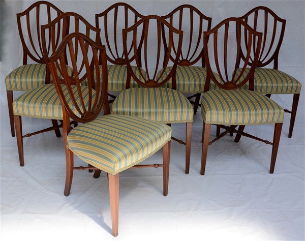 Gruppo di otto sedie in mogano con schienale a scudo, gambe rastremate riunite