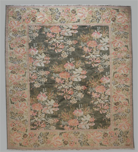 Annodato a mano in lana con iscrizione in basso a destra in lingua armena. Motivo con mazzi di fiori sparsi nel tono del rosa, albicocco, nocciola, rosso, lilla, verde chiaro su campo verde pineta roanato. Grande bordura a fondo color sabbia cosparso di fiori in tema. (cm 357x280) (lievi difetti)