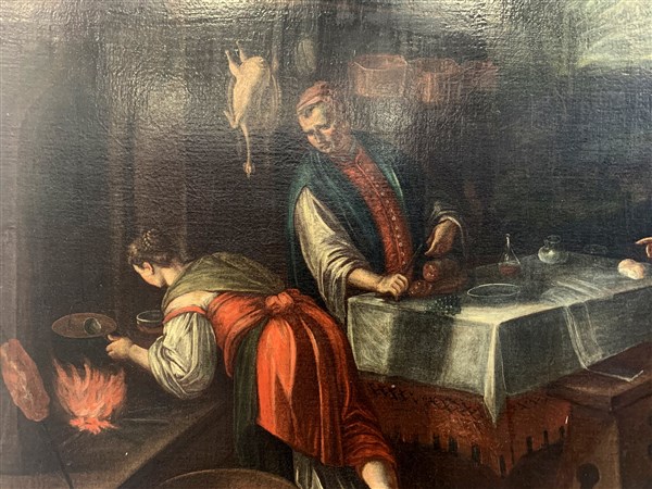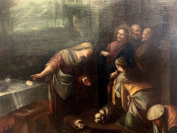 Scuola dell'inizio XVIII, da Jacopo e Francesco Bassano e bottega "Cristo in casa di Marta e Maria e Lazzaro" olio su tela (cm 125x154) In cornice in legno intagliato e dorato (restauri)