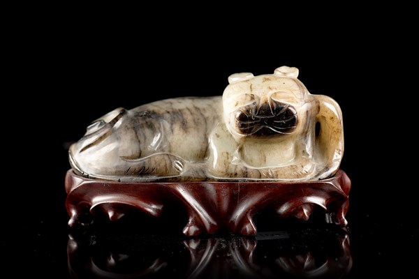 A grey and celadon jade carving of a cat crouching on a leaf, wood base