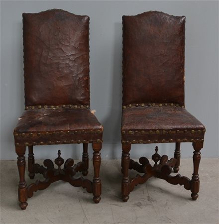 Coppia di sedie del secolo XVII con gambe tornite, crocera sagomata, rivestimento in cuoio (difetti e mancanze)