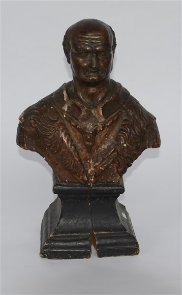 Testa in bronzo raffigurante "Imperatore" montata su mezzo busto in legno intagliato e dorato non coevo (h cm 38) (gravi difetti)