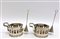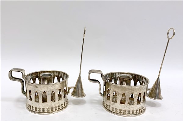 Coppia di bugie in argento con spegnimoccolo a corpo traforato di forma circolare, anse squadrate. Marchi non decifrati (d. cm 9,5) (g 520 ca.)