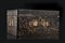 Scatola in legno laccato a fondo nero con decori a figure dorate entro riserve e ramage