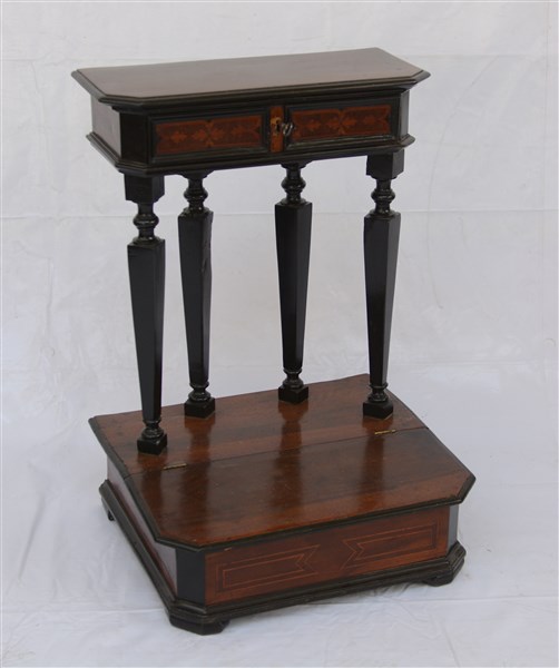 Inginocchiatoio in noce parzialmente ebanizzato, cassetto bipartito, riquadrato e intarsiato sorretto da montanti a balaustra, pianetto inferiore apribile, fine secolo XVIII (cm 56x82x48) (difetti e restauri)