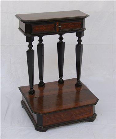Inginocchiatoio in noce parzialmente ebanizzato, cassetto bipartito, riquadrato