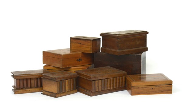 Lot 490 | Lotto di nove scatole con coperchio in legno di diversa epoca e decoro (difetti