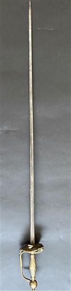 Spada con fornimenti in bronzo e guardia a staffa cesellati a mtivi ad onda. Lama a losanga tipologia di Toledo con incisa nello sguscio la frase latina 'Omnia Vincit Amor'.