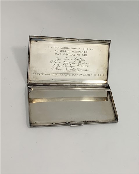 Portasigarette in argento dono degli ufficiali al loro comandante con all'interno iscritto " La compagnia mortai di C.D'A al suo comandante Cap. Giovanni Lui. Fronte Greco-Albanese marzo-aprile 1941-XIX" Titolo 925 (180 g) (lievi difetti)