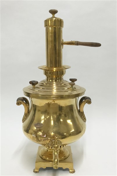 Grande samovar russo in ottone con guarnizioni in legno. Iscrizione impressa su