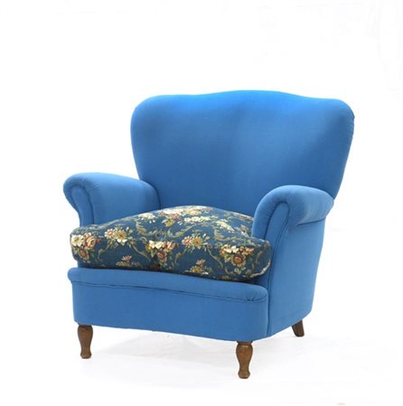 Poltrona con struttura in legno massello, rivestimento in tessuto azzurro. Italia, secolo XX. (cm 88x83x80) (lievi difetti)