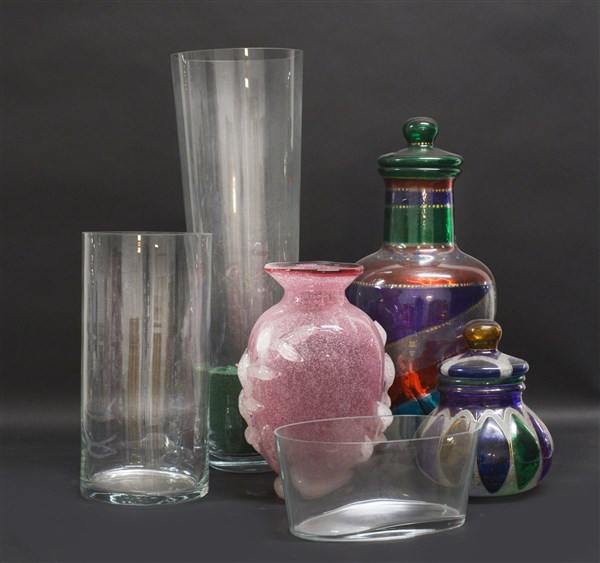 Lotto composto da sei vasi in vetro di epoche e manifatture differenti. Secolo XX. (Misure diverse) (difetti)