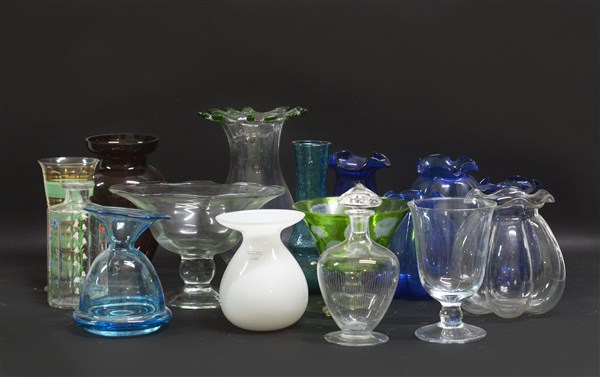 Lotto composto da sedici oggetti diversi in vetro e cristallo di epoche e manifatture differenti. Secolo XX. (Misure diverse) (difetti)