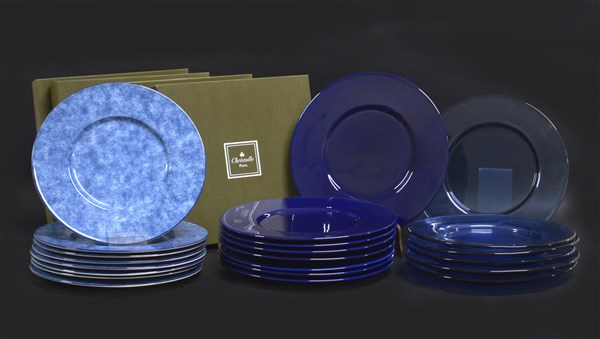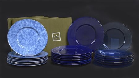 Lotto composto da otto piatti "Christofle" in terraglia, sei piatti in vetro blu e otto piatti in ceramica (difetti)