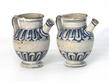 Manifattura del secolo XVIII, coppia di versatoi in maiolica decorata in blu (h cm 21) (difetti, restauri e mancanze)