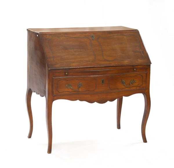 Ribalta di forma mossa in noce con anta e cassetto decorati da cartelle, gambe