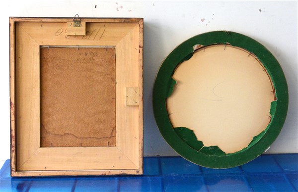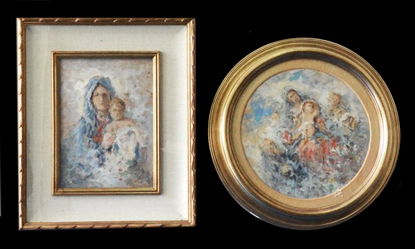 Due dipinti ad olio su faesite e cartone pressato raffiguranri "Sacra Famiglia" e "Madonna con Bambino" (misure diverse) Firmati in basso. In cornici