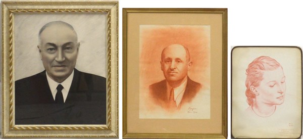 Lotto di tre disegni raffiguranti "Ritratti" autori e misure diverse. In cornici (difetti)