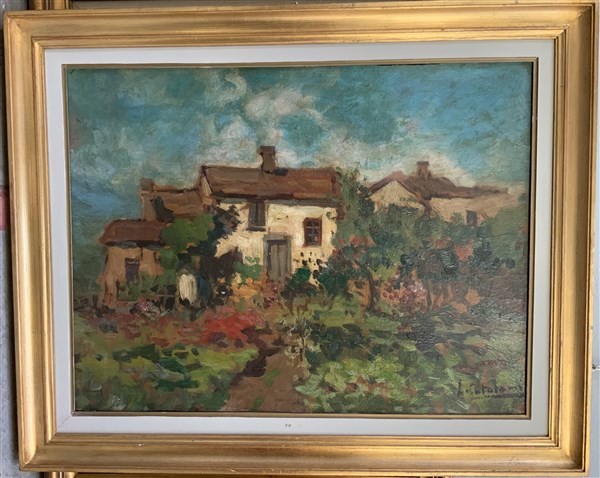 "Rustici" olio su compensato (cm 49x67.5) Firmato in basso a destra. Al retro: titolato e firmato. In cornice