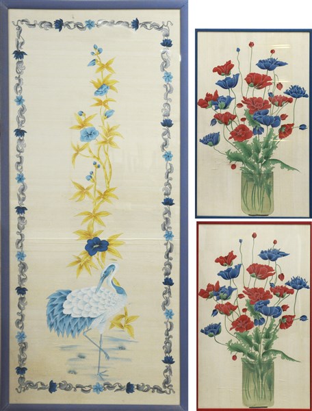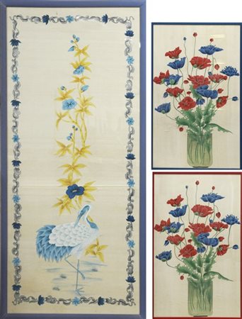 Lotto di tre pannelli dipinti in policromia con vasi di fiori e airone, misure diverse, in cornici (difetti)