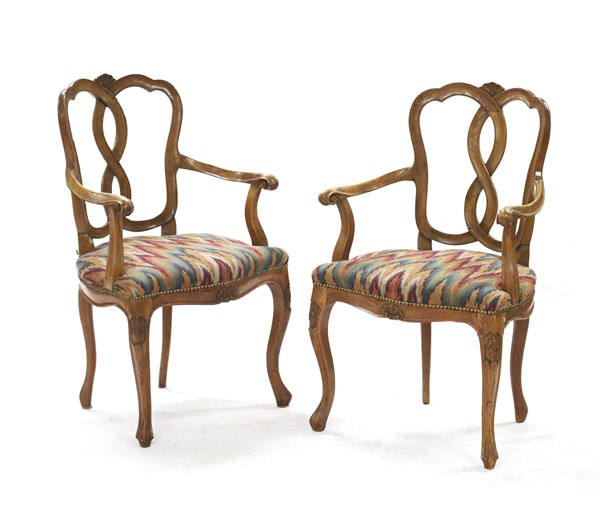 Lot 657 | Coppia di poltrone in noce con schienale "ad otto", braccioli a ricciolo, gambe