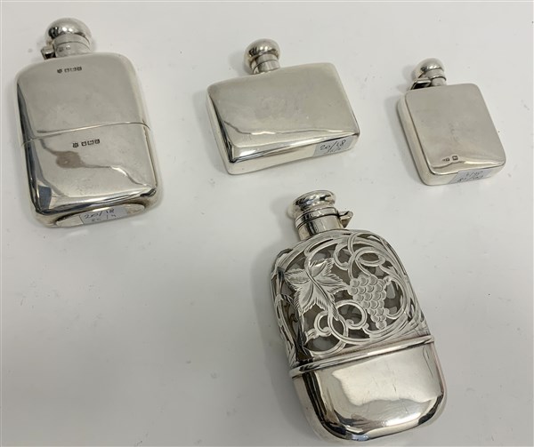 Lotto composto da tre fiaschette da tasca in argento a corpo liscio. Punzoni inglesi di diversa epoca (g 270 ca.) Unite ad una in argento e vetro inciso a foglie di vite
