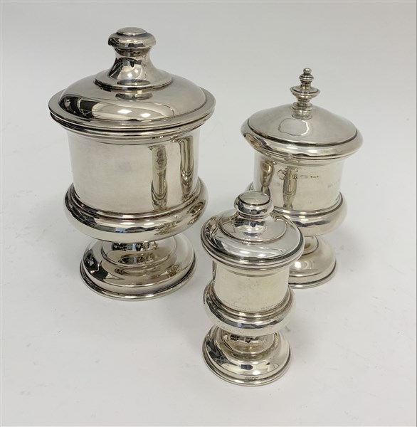 Lotto composto da tre vasi con coperchio in argento con corpo liscio. Titolo 80