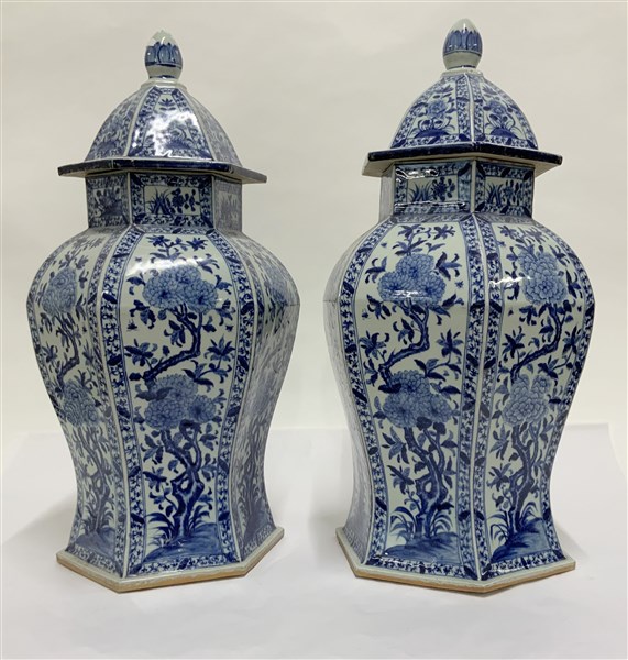 Coppia di vasi in porcellana bianca e blu di forma esagonale decorati a rami fioriti entro riserve (h. cm 63) (lievi difetti)