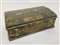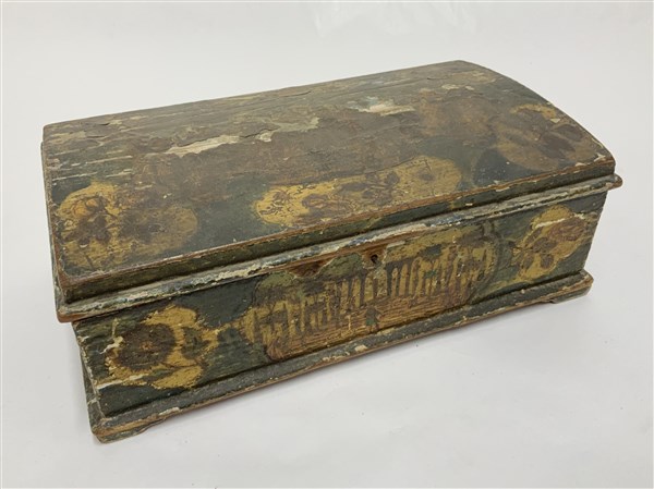 Arte veneta, secolo XIX. Scatola laccata in arte povera a figure in paesaggi (cm 29x10x16) (gravi difetti)