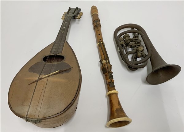 Lotto di tre strumenti musicali di cui un clarinetto in bosso ed avorio databile alla fine del XVIII secolo (imboccatura mancante ed altri difetti), un mandolino di origine catanese e databile all’inizio del XX secolo con una etichetta del negozio Viscardo Maccolini di Milano (mancanze e difetti) ed una tromba a tre pistoni in ottone (mancanze e difetti)