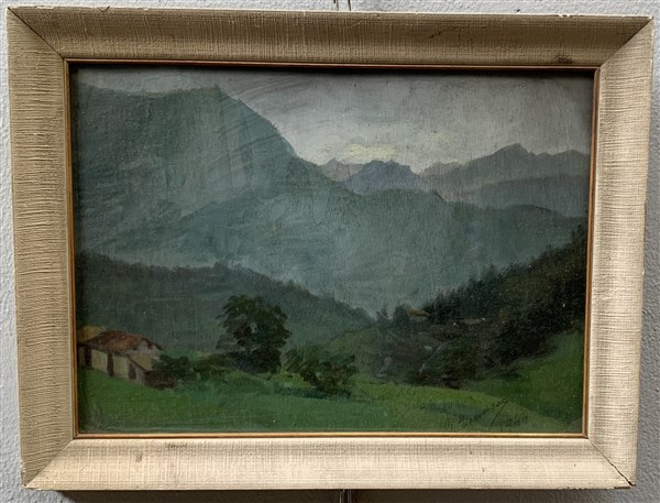 Firma indecifrata "Paesaggio di montagna" olio su compensato (cm 28x38) Firmato e datato 1944 in basso a destra. In cornice
