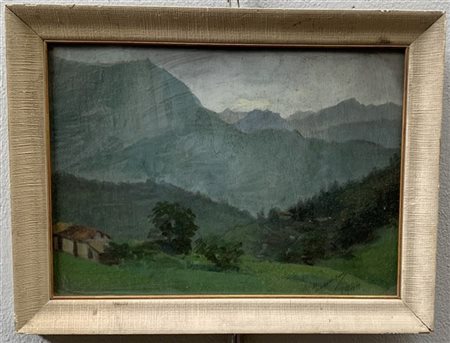 Firma indecifrata "Paesaggio di montagna" olio su compensato (cm 28x38) Firmato