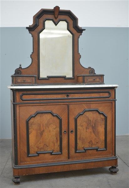 Credenza con alzata a specchio lastronata a due ante ed un cassetto. Profili ebanizzati, piedi torniti, piano in marmo. Secolo XIX (cm 122x103x62) (difetti)