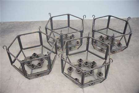 Gruppo di quattro lanterne da esterno in ferro battuto a dodici luci (difetti)
